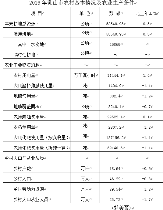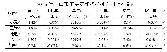 【概况】 2016年,乳山市农作物播种面积7.75万公顷,比上年增加13.6%。其中,粮食作物播种面积3.76万公顷,比上年减少6.9%;经济作物播种面积1.9万公顷,比上年增加2.7%。全年粮食总产量20.95万吨,比上年减少15.2%。蔬菜及瓜类种植面积0.92万公顷,与去年持平,总产量45.8万吨,增加0.05%。 【农业技术推广应用取得新成就】 2016年,推广测土配方施肥技术,年内化验土样520个,化验项次2600项次,拟定配方11个,全市配方施肥应用面积76666.7公顷。推广小麦“一喷三防”、小麦宽幅精播、“花生套餐”技术、玉米“一增四改”、玉米“一防双减”、玉米晚收、农作物病虫害综合防治等新技术,取得较好效果。 【优良品种全覆盖】 2016年,在南黄镇南黄村建设小麦新品种展示基地5.5公顷、展示品种14个,建设玉米新品种展示基地面积7.95公顷、展示品种94个。重点推广烟农5158、烟农999、青丰1号等新优品种,全市优良品种覆盖率100%。承担2016年粮食高产创建示范方建设项目,在乳山寨镇、夏村镇52个村建设面积2000公顷高产示范方,经威海市农业局组织专家测产验收,小麦、玉米两季平均亩产1160.2公斤,超额完成项目要求的1100公斤产量指标。 9月18日,威海市农业局组织专家对乳山市2016年粮食高产创建示范方建设项目玉米产量进行测产验收。 (农业局提供)