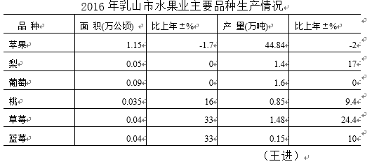 【概况】 2016年,乳山市果园总面积19836公顷,果品总产量43.38万吨,其中,水果42.68万吨,较上年减少8.1%,干杂果0.7万吨。全市果品收入20亿元,其中苹果收入18亿元。 【大宗水果收购价格比去年略降】 2016年,乳山市苹果套袋数与往年持平,苹果总产量比上年减少2%。价格比往年下降。80毫米富士苹果混级收购价格3元/千克~5元/千克,80毫米以上富士苹果最高8元/千克,红香蕉、红星直径80毫米以上混级苹果收购价格5元/千克,嘎拉苹果直径75毫米价格3元/千克~4元/千克,红将军苹果混级直径80毫米收购价格平均4元/千克、一级80毫米果最高5元/千克。梨产量比上年减少,价格与上年下降。葡萄产量比上年增加,价格在3~5元/千克。桃产量与价格均与上年持平,樱桃平均单产比上年增长5%,杏单产比上年增长5%~10%,价格与上年持平。 【发展苹果现代矮砧集约栽培面积182公顷】 2016年,继续实施乳山市现代农业生产发展资金苹果产业项目,在白沙滩镇白沙滩村、大孤山镇宫家桃村、夏村镇马家庄村、育黎镇塔庄村、冯家镇东官庄村、大孤山镇吴家沟村建设苹果现代矮砧集约栽培示范园6个,成方连片面积均13.33公顷以上,总面积108.7公顷;乳山市高效特色农业发展平台项目获山东省财政扶持资金600万元,在冯家镇消水河村(2处)、东官庄村、大孤山镇河南村、育黎镇老由古村建设苹果现代矮砧集约栽培示范园5个,成方连片面积均13.33公顷以上,总面积73.3公顷。 【威海市第七届苹果擂台赛上收获颇丰】 11月28日,选送18个优秀苹果样品参加威海市第七届苹果擂台赛,获一等奖1个、二等奖1个、三等奖1个、优秀奖15个,获“优秀品牌奖”二等奖4个,乳山市农业局获“优秀组织奖”。 【意大利果树专家来乳山授课】 2016年,实施国外智力引进项目。5月13日,邀请意大利果树专家Kurt werth到乳山市对果农进行技术指导,在乳山市宏图培训学校授课,在冯家镇消水河村、东官庄村、白沙滩镇白沙滩村苹果矮砧集约栽培示范园进行修剪及拉枝等技术现场指导,180名果农参加培训。 5月13日,意大利果树专家现场传授现代苹果栽培管理技术(农业局提供)